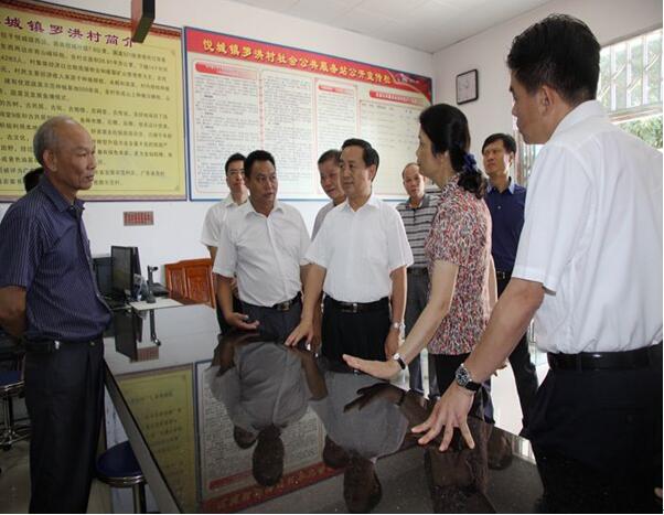 图为2015年省领导黄先耀到我县悦城镇罗洪村、九市镇上垌村调研便民服务站、村务公开和惠民政策落实等情况(2015 年7月28日摄)